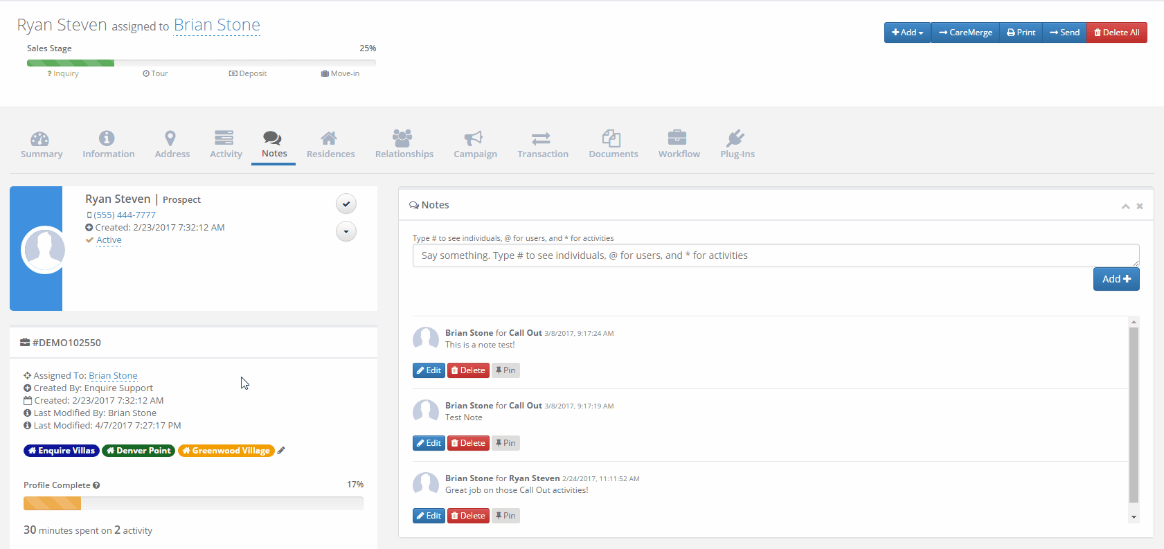 With the Sticky Note feature, you can pin a note to the top of a profile. The user assigned to the profile will be alerted that there's an important note they need to see.