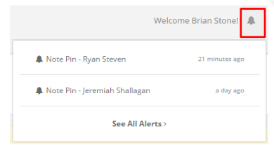 Step 4: When notes are pinned to a profile you are assigned, click the bell icon at the top of the page and it will show in your notifications as Note Pin followed by the name of the profile.