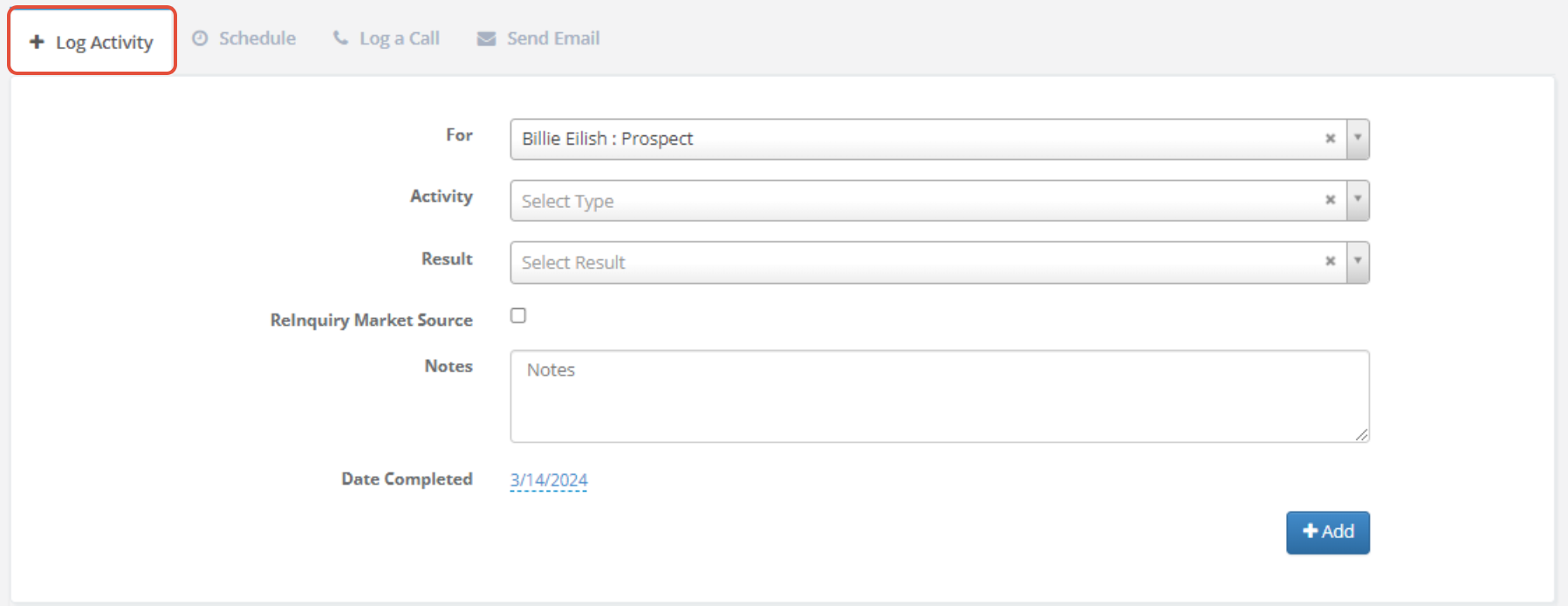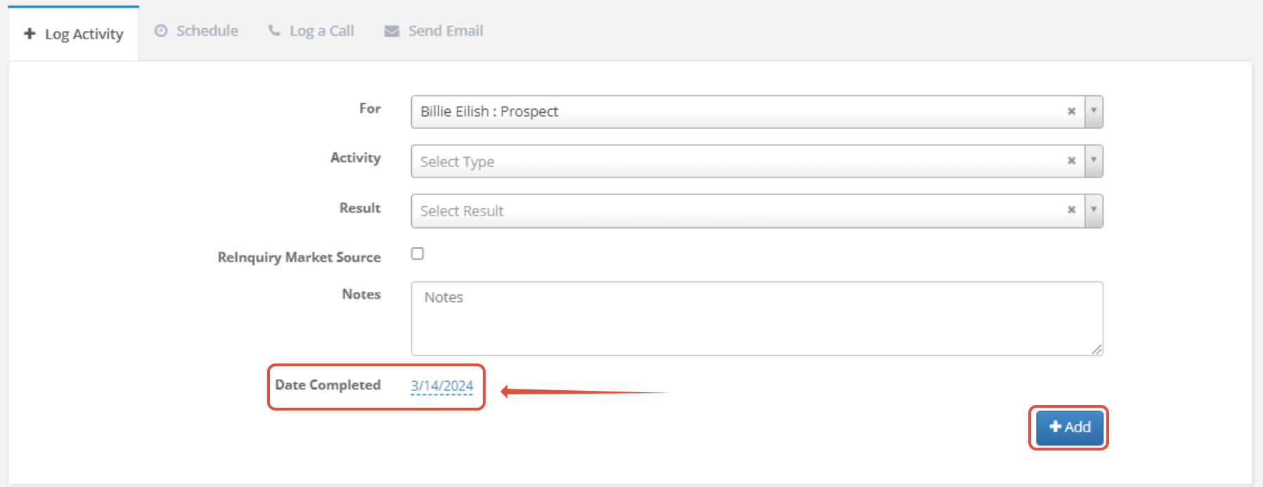 Step 3: When filling out the Log Activity form, make sure to change the Date Completed date to when the activity occurred. Click Add.