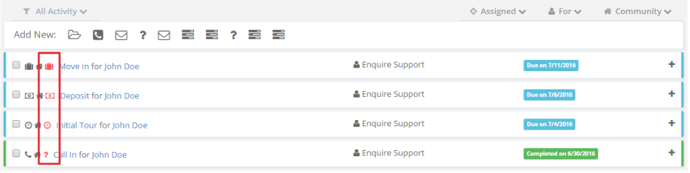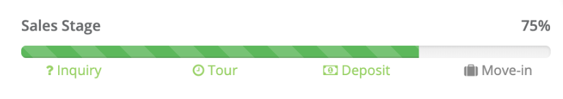 Sales stages are an important tool used in tracking where a lead is in the sales process. Enquire CRM uses four sales stages: Inquiry, Tour, Deposit, and Move In. As you add certain types of activities, you will see this bar progress. Only certain types of activities will count towards a specific stage and only the first instance of that type of activity will be flagged in the Sales Stage.