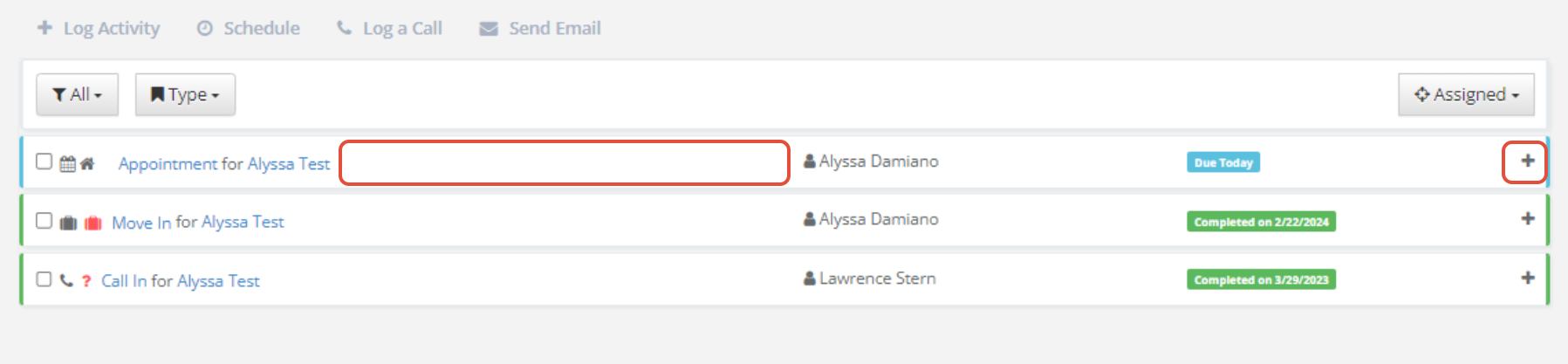 Note: If you're completing an activity for someone else, you will see the Assigned User drop down that will default to your name. If desired, you can update this name if someone else should be getting credit for the activity.