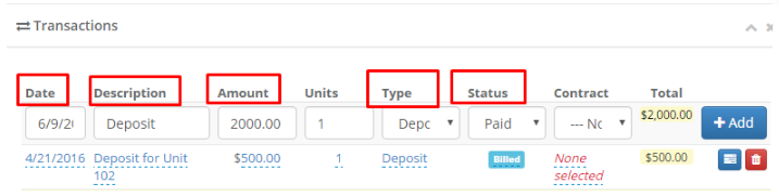 Step 2: Enter in the Date of the Transaction, a brief description, the Transaction Type, the Dollar Amount, and the Status of the transaction (whether it was Billed, Paid, Cancelled, etc.)