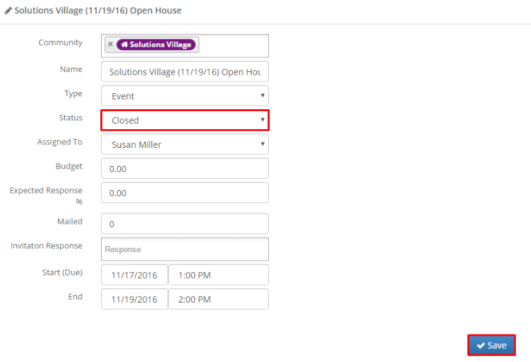 Step 3: Click into the Status field and choose Closed. Click the blue Save button to confirm your changes.