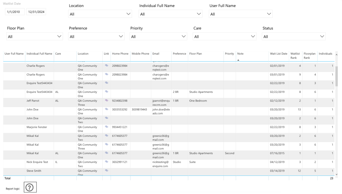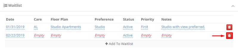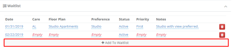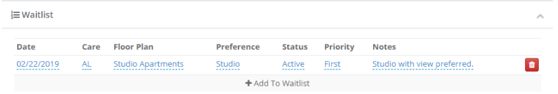 | Status | This can be either Active or Inactive. Active indicates the individual is currently on the waitlist for the specified Care, Floor Plan, and Preference. Inactive indicates the individual is no longer interested in the specific Care, Floor Plan, and Preference or they have moved in. |