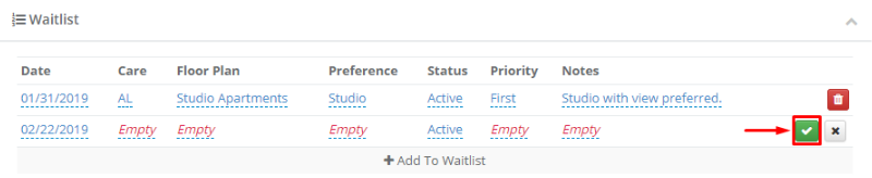 Step 3: To the right of any waitlist item, click the small red trash can icon and click the green check mark to confirm or click the grey X to cancel.