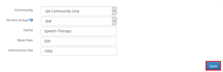 Step 3: Choose a Community, Service Group, enter a Name, and Base Fees and Admissions Fee if needed. Click Save.