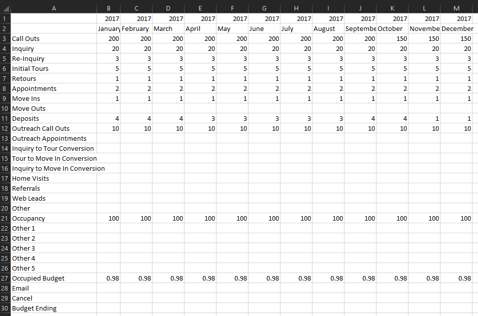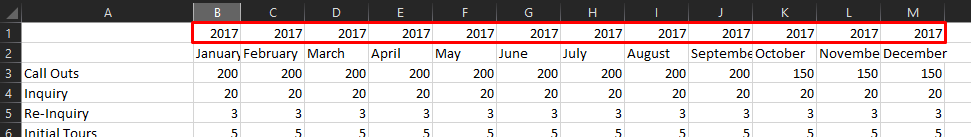 • You can specify the year for your goals by updating the Year row (just above the month row) in the template. Updating each cell in this row is required for Goals to be input for the correct year.