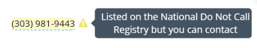 The yellow caution symbol indicates the individual is registered on the Do Not Call registry, but the individual has reached out and contacted your community. This "okay to contact" window is open for 90 days and after that 90 days, the individual will move back to a Do Not Call status. The yellow caution symbol is determined by any activity for the individual that has a Master Type of Inquiry, Call In, Web Form, Referral, and Email In.