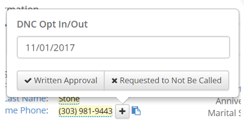 To the right of the phone number you would like the DNC status for, click the grey + button. The DNC Opt In/Out pop over will appear. You will choose the opt in/out request date and click the reason for the individual opting in (Written Approval) or opting out (Requested To Not Be Called).