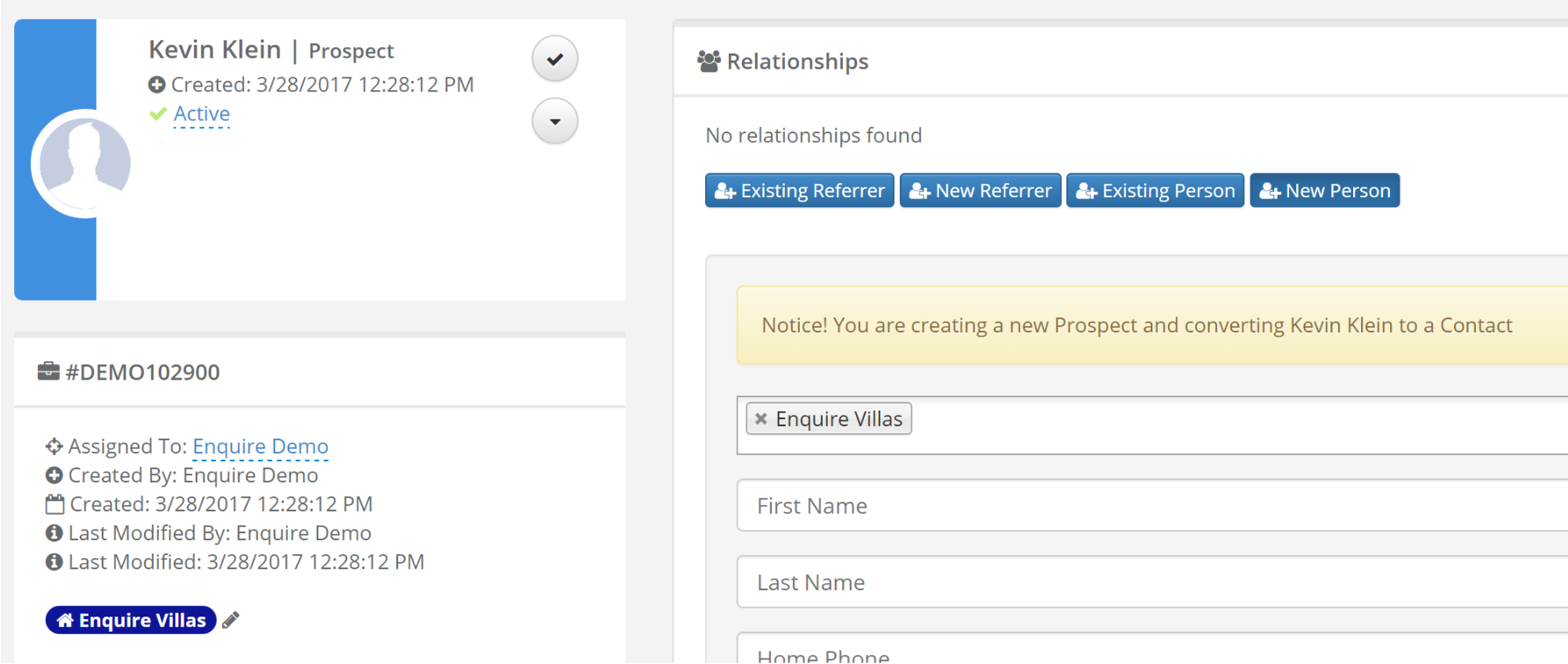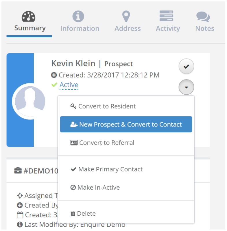 Sometimes we know that a prospect may come in from the web or a referral agency with no associated contact. When that happens you may call the person or speak with them and realize they are the adult child. In this case, you will convert the person to a contact and add a prospect. If you don't know the name you can enter a generic first name and copy the contact's last name. Ex: "Unknown McFly" or "Mom McFly" to hold the place.