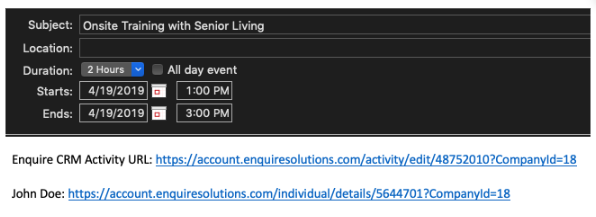 Activities with a start and end time will sync to the calendar in Google. When a timed activity is successfully synced to your Google calendar, it will display at the date and time specified in Enquire and the subject set to the name of the activity in Enquire. The event notes/detail will contain a link to the activity and individual in Enquire.