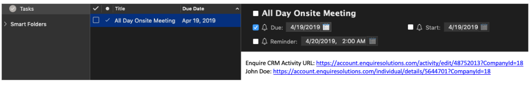 Activities marked as All Day will sync to the tasks section in Google. When an all day activity is successfully synced to your Google tasks folder, it will display with the date specified in Enquire and the title set to the activity description in Enquire. The task notes/detail will contain a link to the activity and individual in Enquire.
