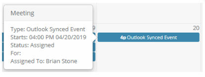 When events from your Google calendar are successfully synced to your Enquire calendar, they will display on your calendar at the time specified in Google and as the activity type setup by your Admin. Hovering over the activity will display additional information about the activity.