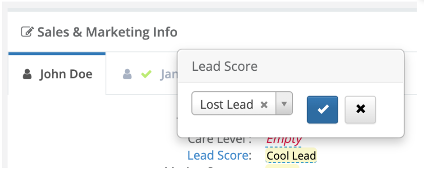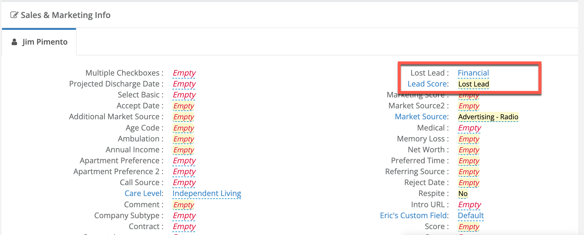 Step 5: For lost leads, users can edit the Lead Score and Lost Lead fields to record applicable data, such as the below example where Lead Score = Lost and Lost Lead = Financial.