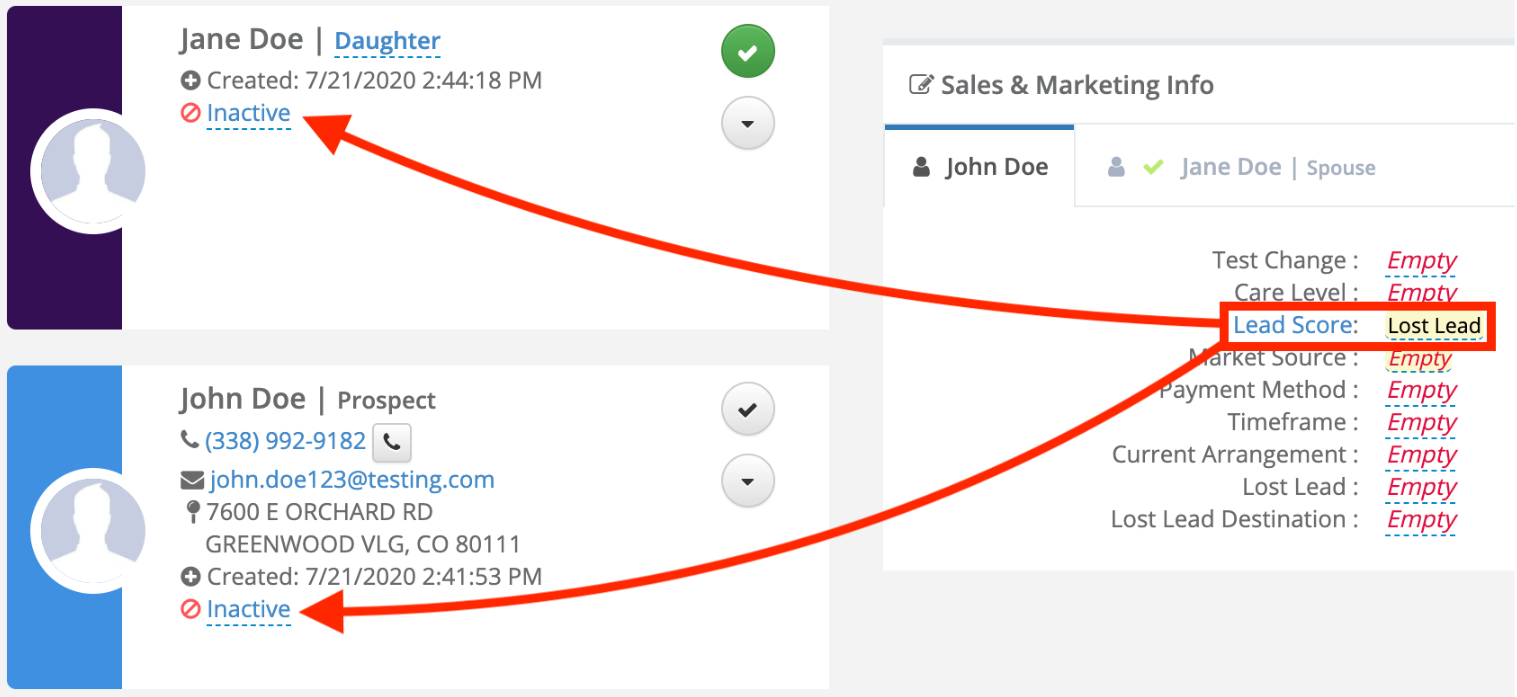 The Aline CRM has automation in place to automatically inactivate the Primary Individual (Prospect/Referral or Resident/Patient) and their Primary Contact when their Lead Score/Status Code is set to a value that has a Lead Score Master Type of any of the following:
