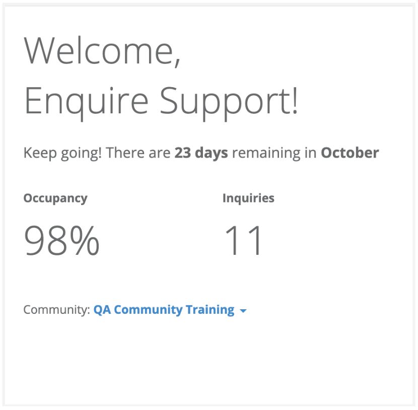 The Welcome widget displays your current default location's occupancy and total inquiries for the current month. If you have access to more than one location, click the "Community" drop down to select a different location.