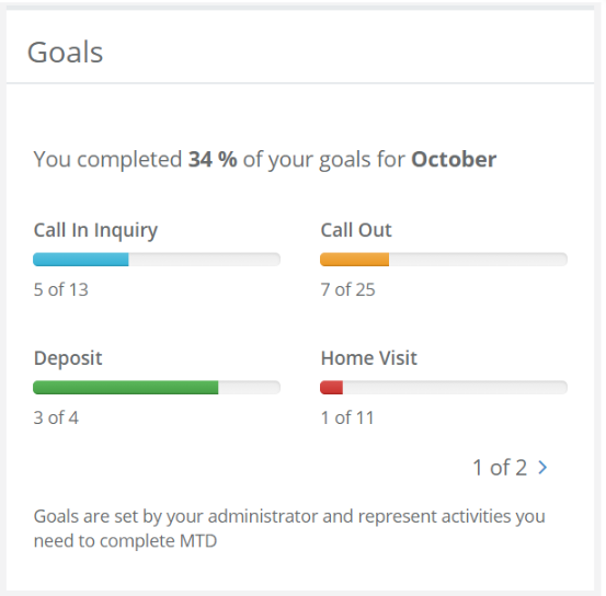 The Goals widget displays your Activity goals for the current month for your default location and your progress towards each goal. This widget will show your progress towards all goals as a percentage and each goal is broken down and displayed with the number of activities you have completed towards the goal's total.