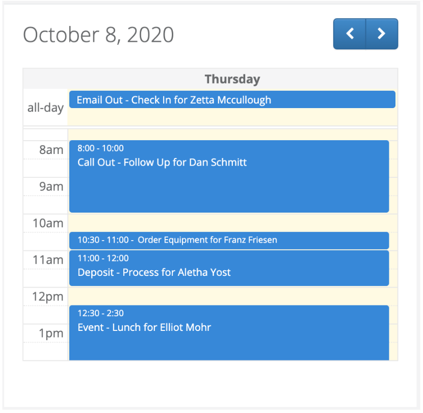 The Calendar widget displays your due activities by day and time with all-day activities (activities without a specified start and end time) displayed at the top of each day. This widget will default to the current day, but you can click the left and right arrow buttons in the upper right to go back or forward days. If you click on the activity, you will be re-directed to the individual's profile and can complete the activity from the profile. Completed activities will no longer display on the Calendar widget.