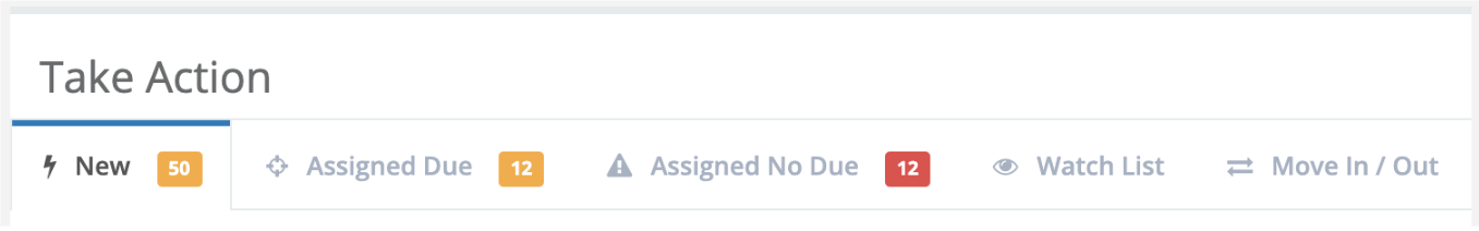 The Take Action widget is a series of tabs displaying new leads, individuals with and without assigned activities, your Watch List, and move ins and outs. Click each tab to change the view of displayed data.