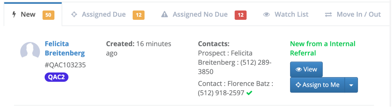 The New tab displays new leads from your company's digital lead integrations, like A Place For Mom, Caring.com, and your company website. Each individual is displayed with their contact info and their primary contact's phone number. The way you get the profile to no longer appear in this tab is to update the Assigned User. You can quickly assign the individual to yourself using the Assign to Me button or click the drop down arrow to assign them to another user at your location.