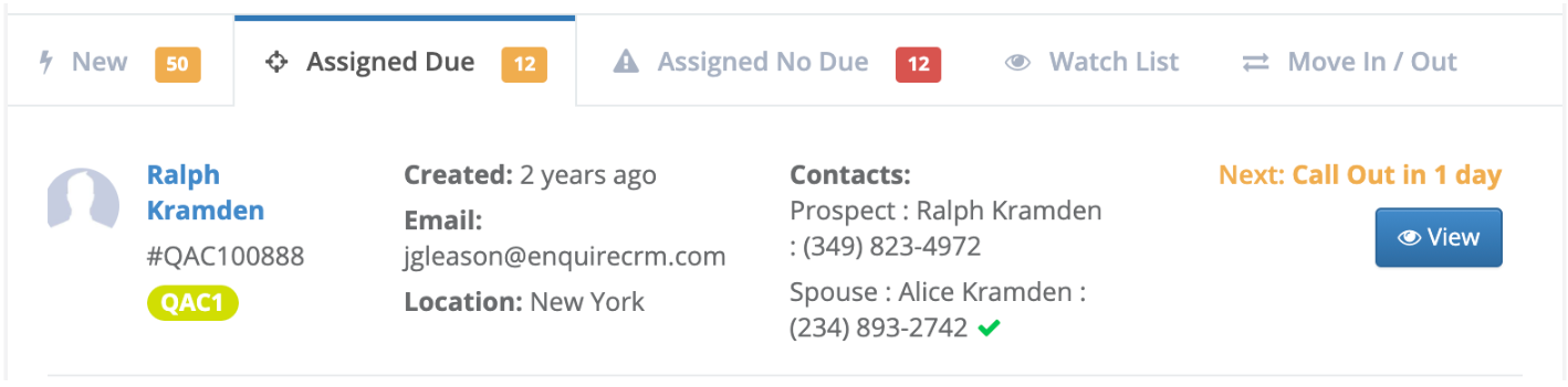 The Assigned Due tab displays the active individuals currently assigned to you with a next scheduled activity. Each individual is displayed with their contact info and their primary contact's phone number. The next activity type will display on right side in orange text.