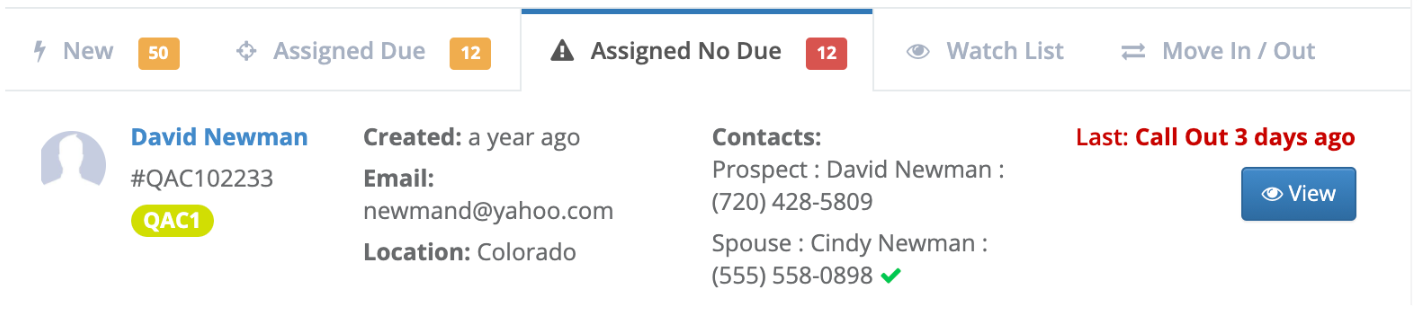 The Assigned No Due tab displays the active individuals currently assigned to you that do not have a next activity scheduled. Each individual is displayed with their contact info and their primary contact's phone number. The last completed activity type and time for the individual will display on the right side in red text.