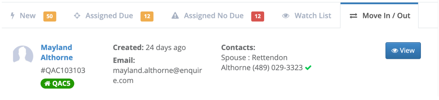 The Move In / Out tab displays individuals with a Move In or Move Out date in the last 7 days as well as individuals with a Move In or Move Out date in the next 60 days. Move Ins and Move Outs are determined by the individual's Housing Contract Move In or Move Out date.