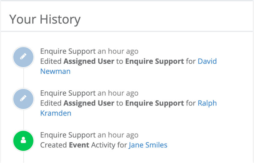 The Your History widget displays recent changes you have made to individuals. This includes actions like field updates, user assignment, and creating activities. Click the individual's name to navigate to their profile.