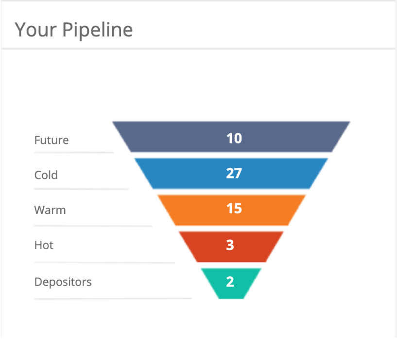 The Your Pipeline widget displays the count of all active individuals with a Lead Score that has a Master Type of Future, Cold, Warm, Hot, or Depositor. Click this widget to navigate to the Sales Pipeline Report for more detail.