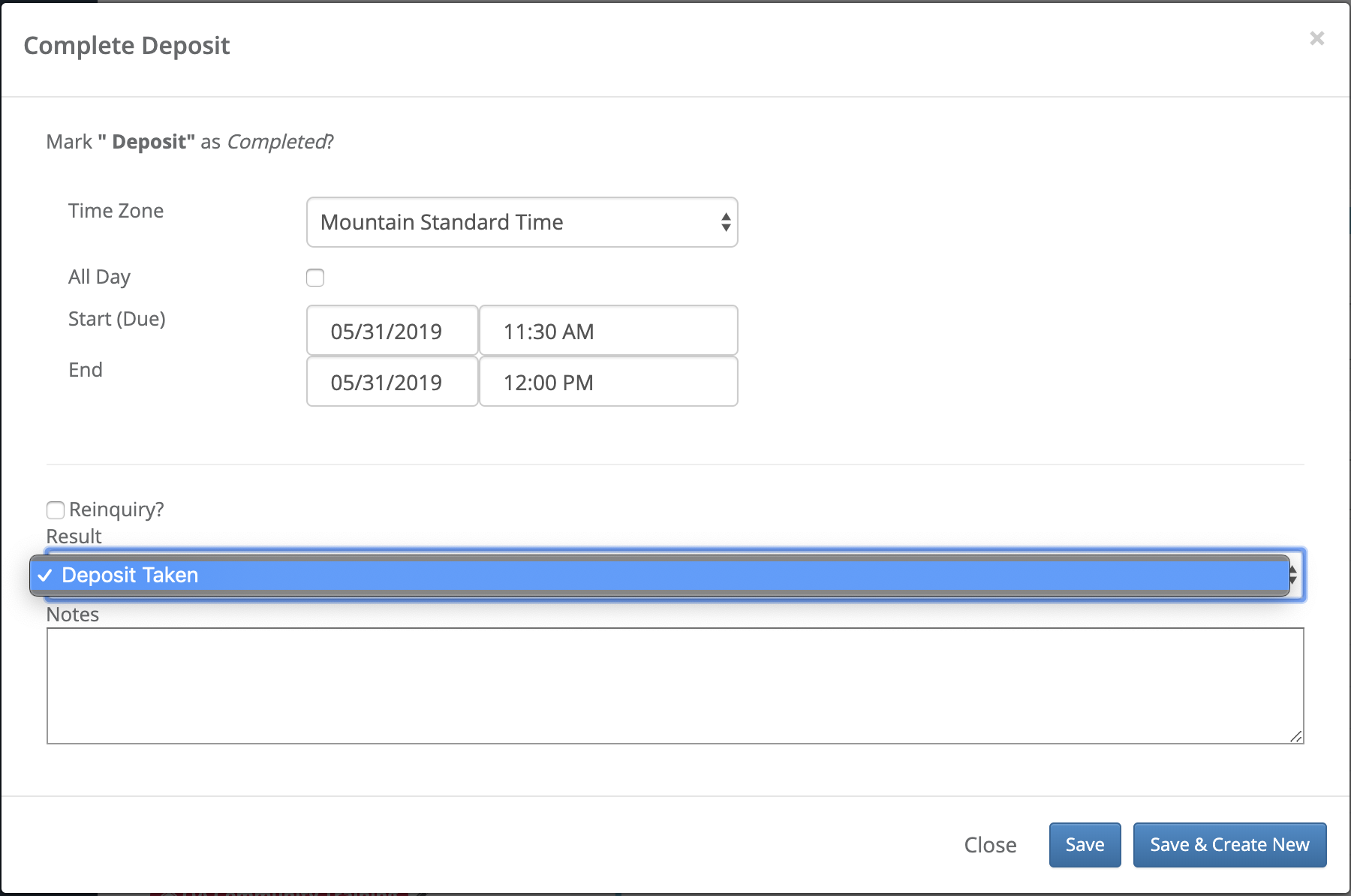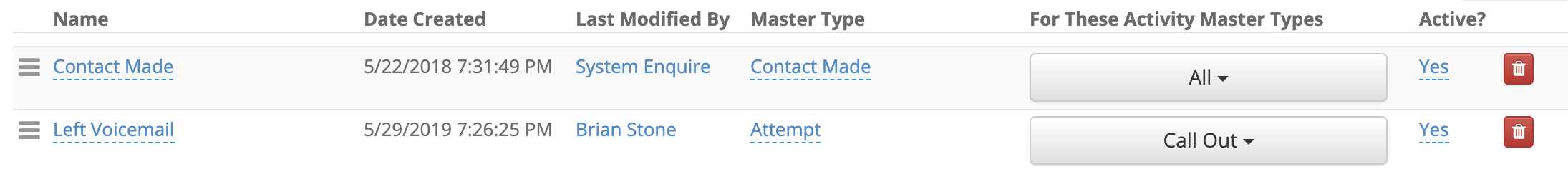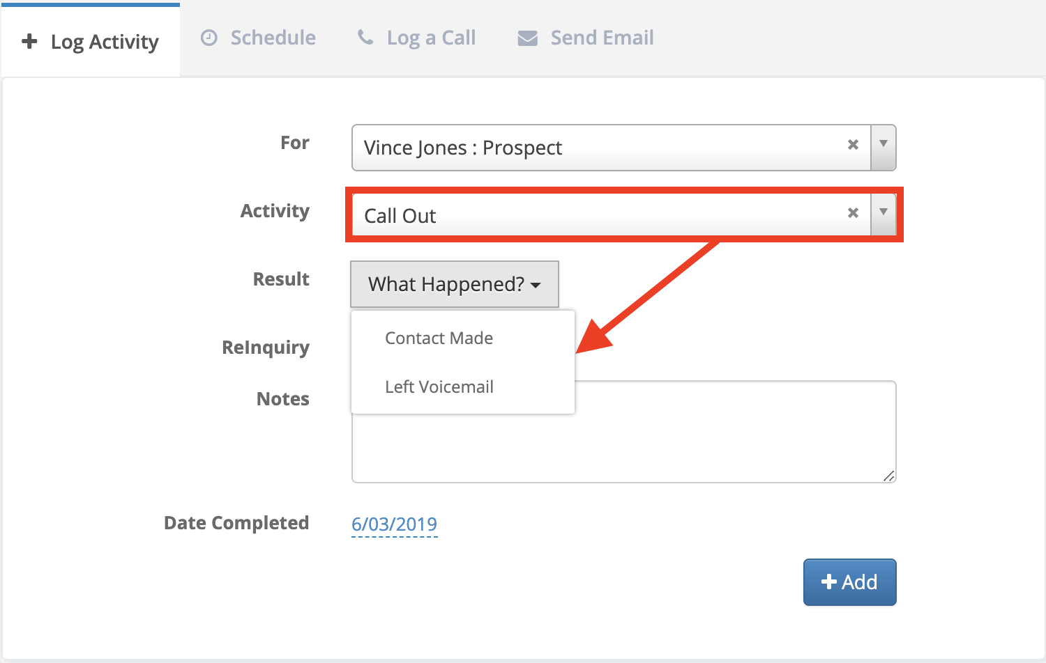 When logging or completing an activity with a master type of Call Out, both Contact Made and Left Voicemail can be selected from the Result drop down: