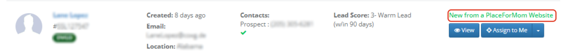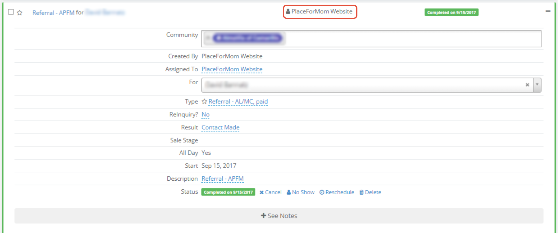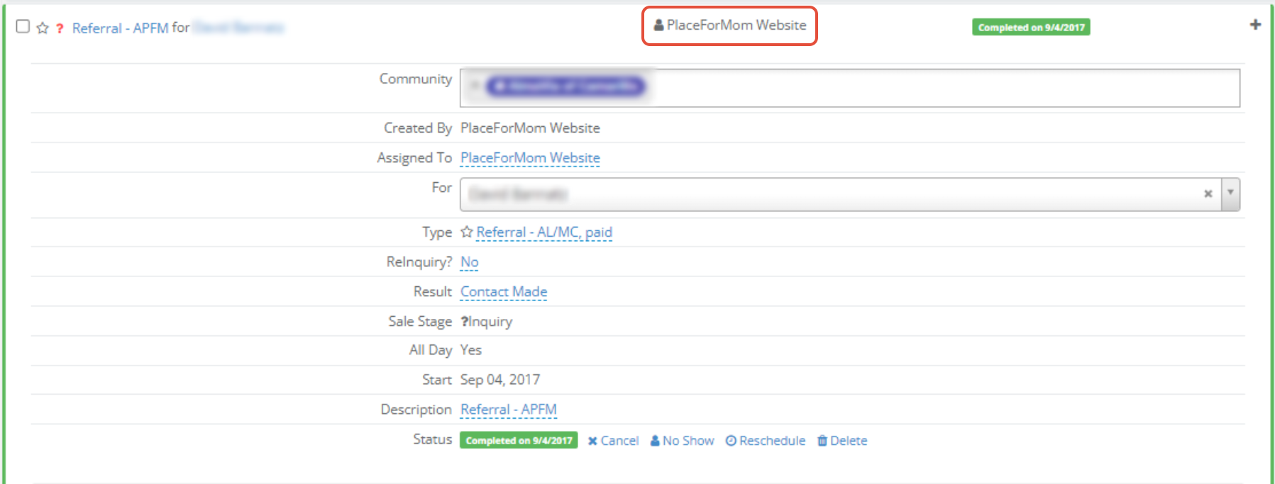 A Place for Mom will send a referral activity to the leads profile to start the sale stage.