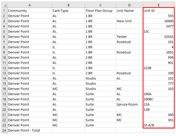 You will need to make sure that the Unit numbers match between Enquire CRM and Eldermark. The Unit number is what Enquire CRM and Eldermark use to ensure individuals are synced to the correct Unit when a Transfer or Move Out occurs. We recommend exporting the Inventory Report to Excel and using the Unit ID column.