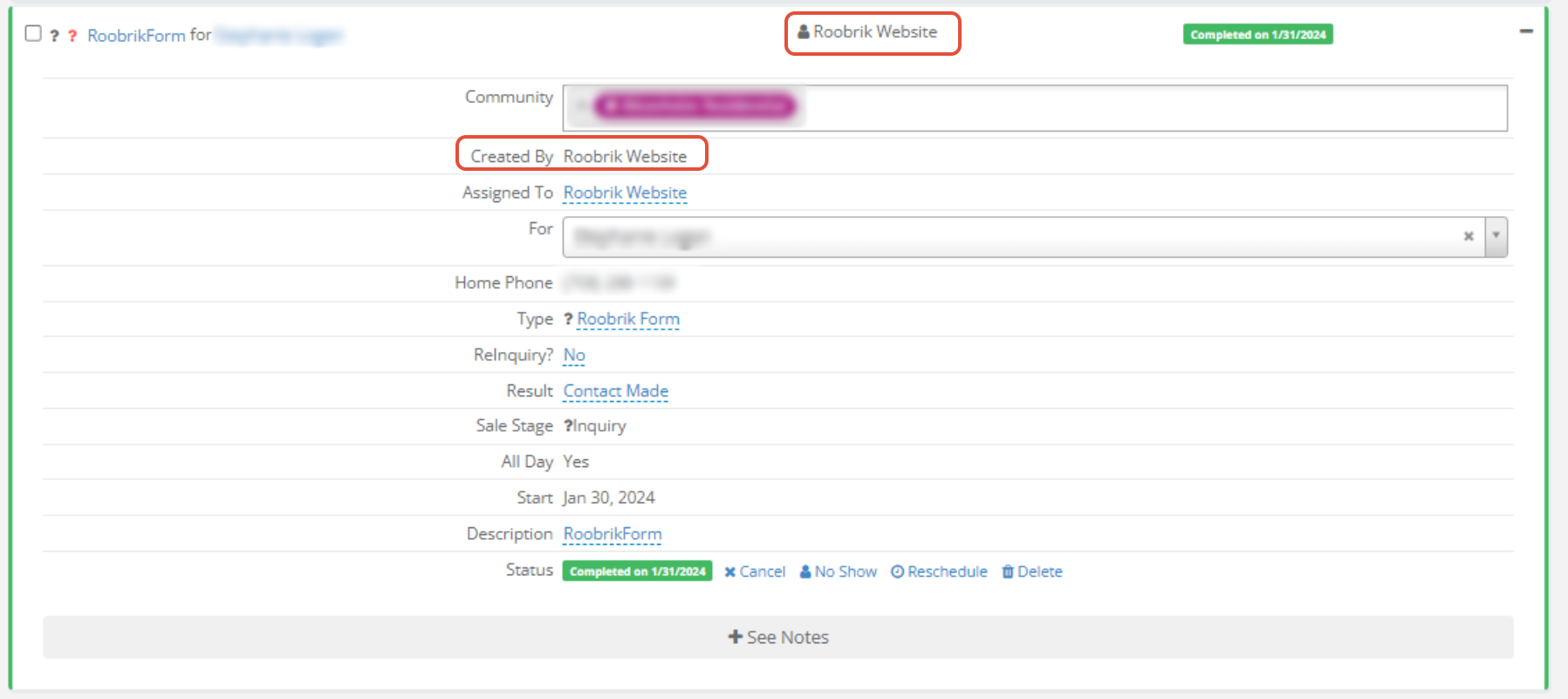 When leads are entered from Roobrik, they will display in the New Leads box on your dashboard with a Created and Assigned user of Roobrik Website. Like other integrations and digital leads, you will need to make sure you reassign the individual so they are removed from the New Leads box.