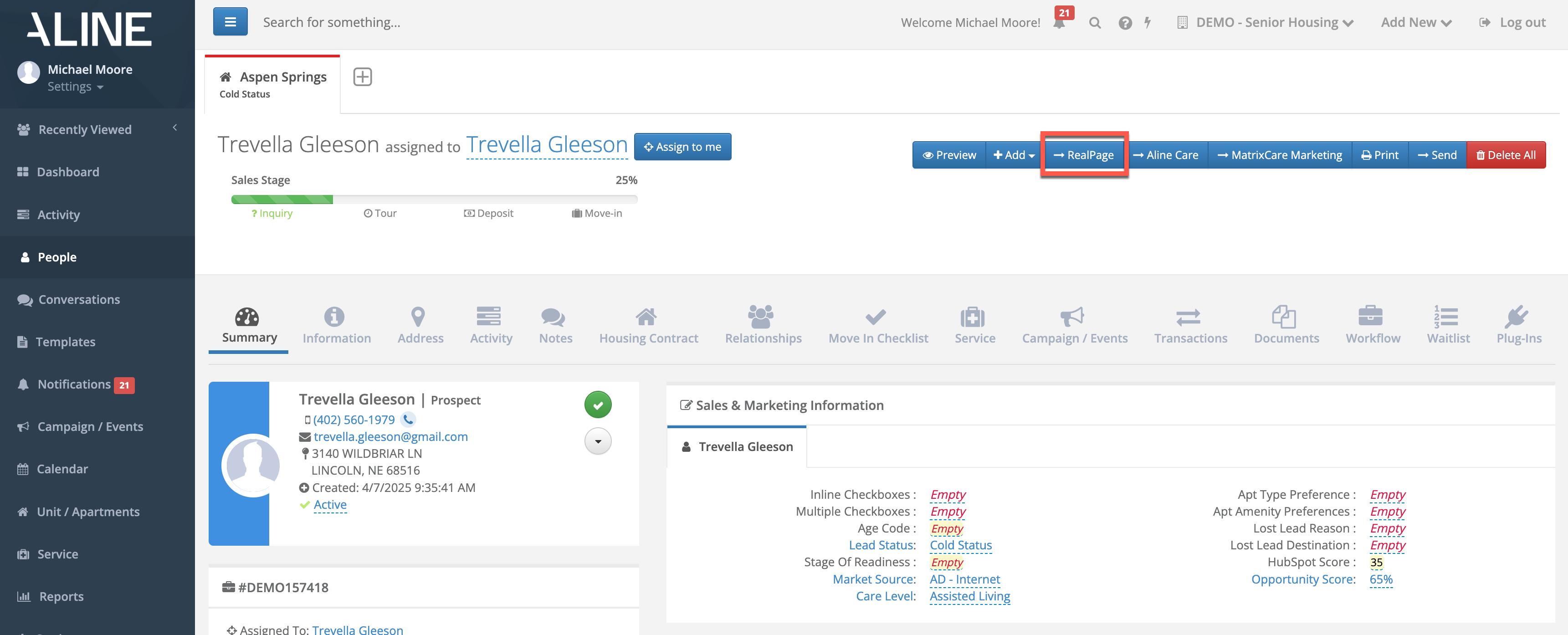 In the upper right section of the profile, select the blue button labeled RealPage. This will send the individual to RealPage with the above fields and their values.