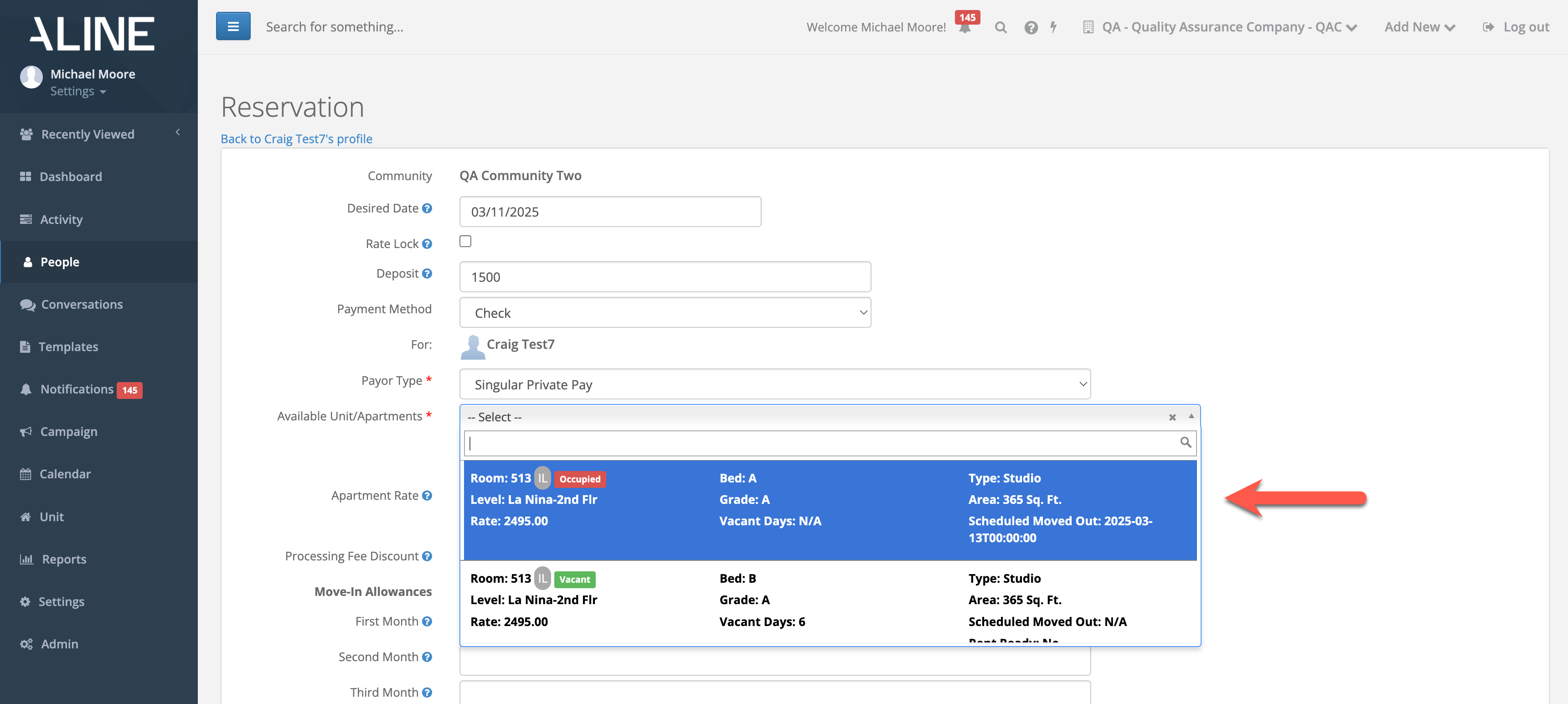 All reservations will require an Available Unit/Apartment selection. Select Available Units/Apartments to view a list of ALL the property's units along with their associated details. The details will include whether the room is already occupied/vacant and rent ready in addition to room number, level, rate, Bed, Grade, Vacant Days, Type, Area (Sq. Ft.), and Scheduled Move Out.