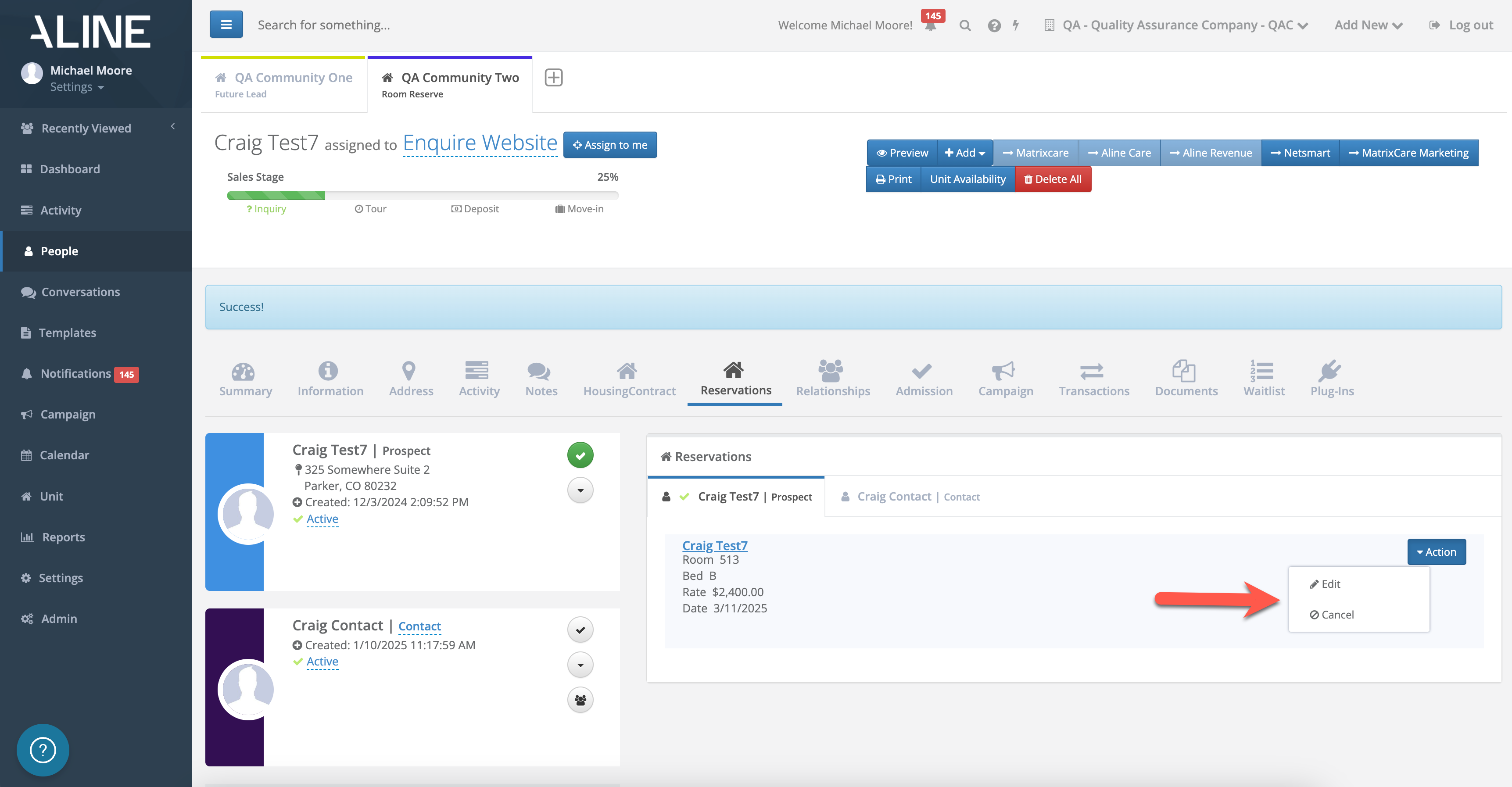Active reservations will display on the patient's profile in the Reservations Module. Reservations can be modified or canceled all together by selection the Actions button on the existing reservation.