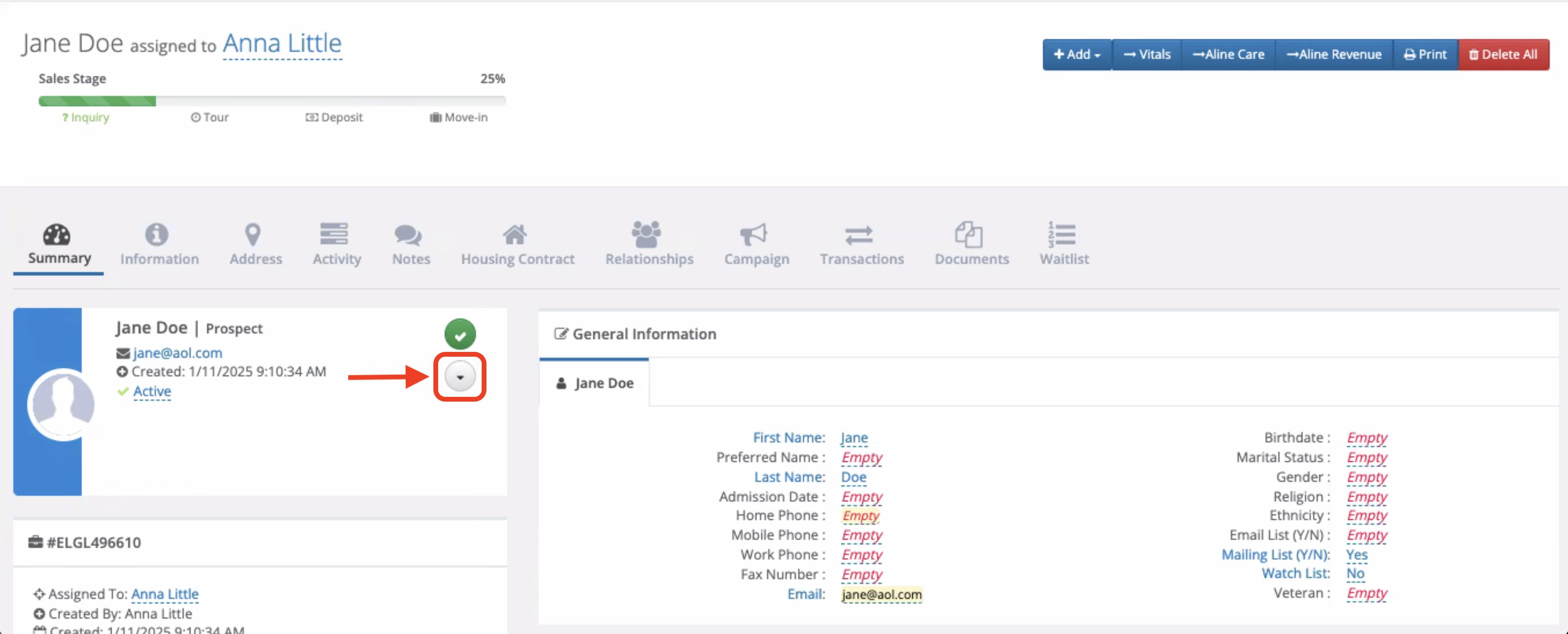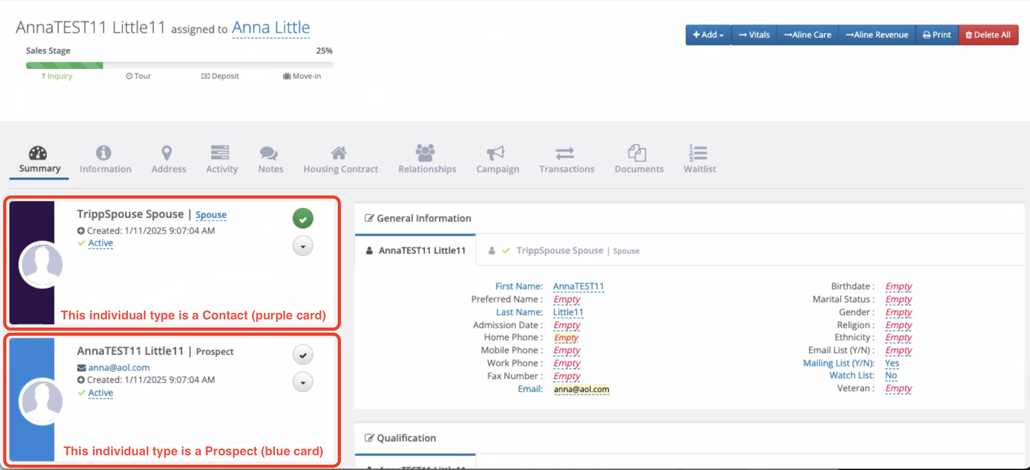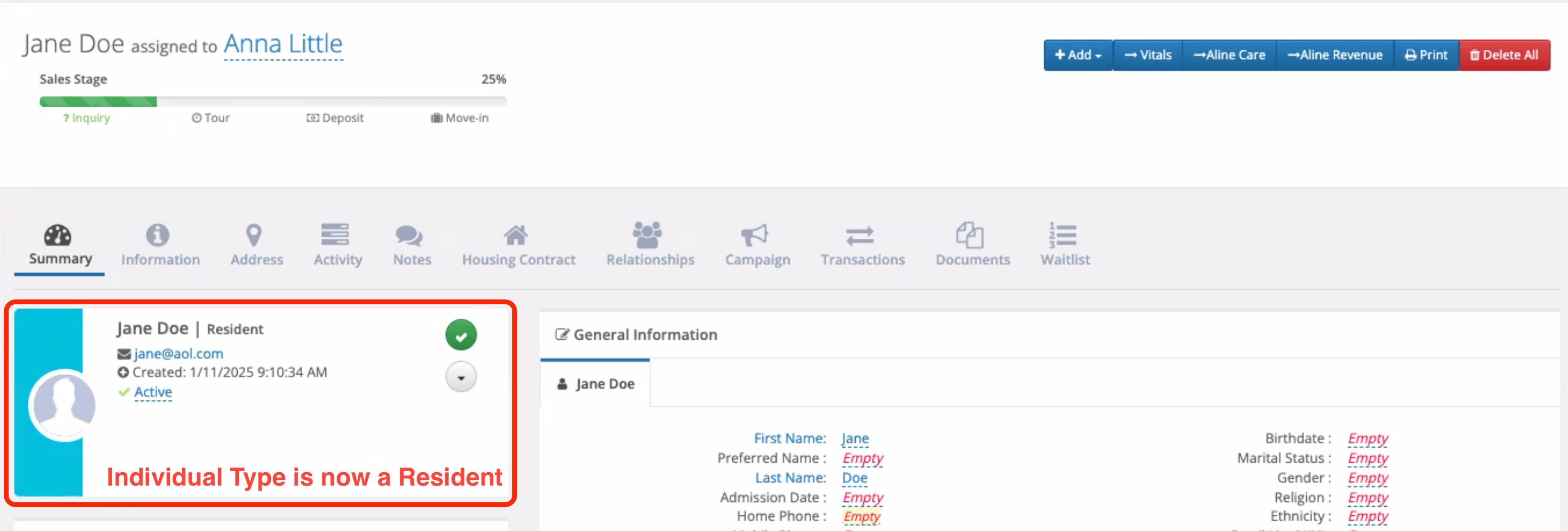 In order to send a profile to either Aline Care or Aline Revenue, you first will update the Individual Type for a single Prospect to Resident, and for a couple from a Prospect and a Contact to both being Residents.