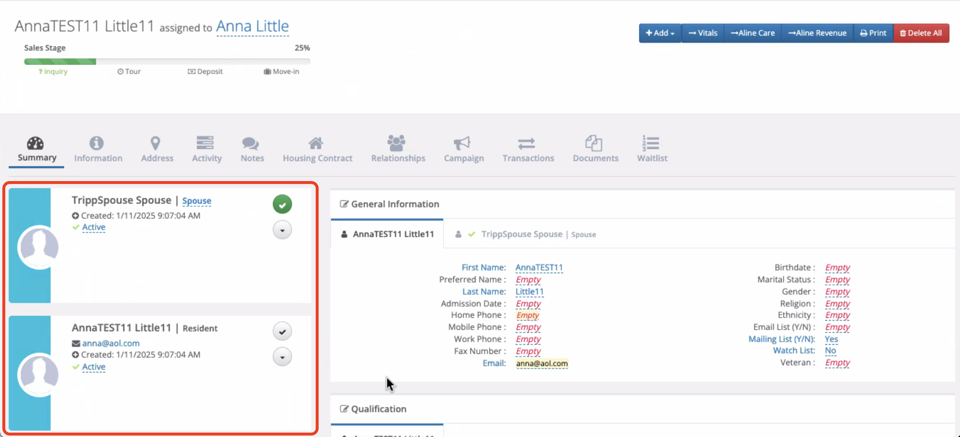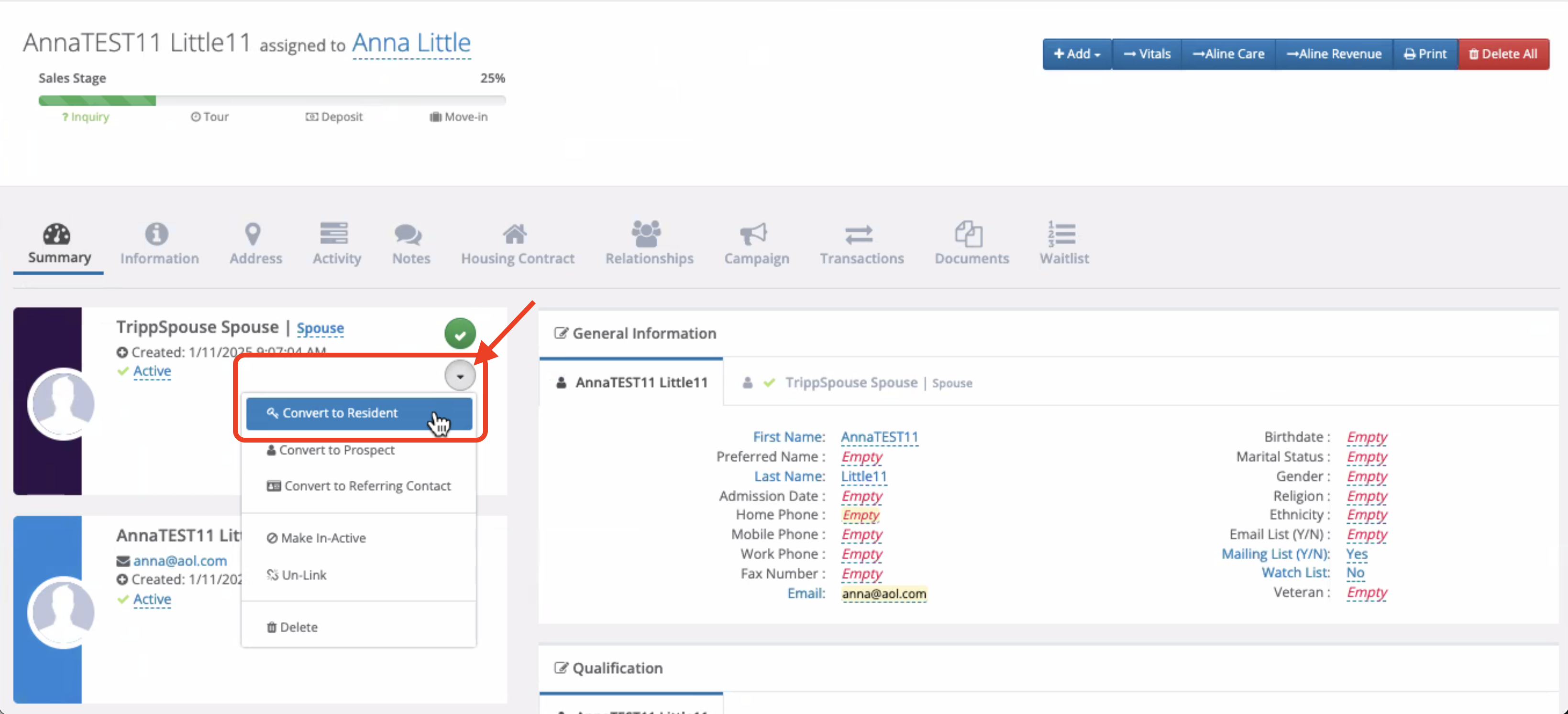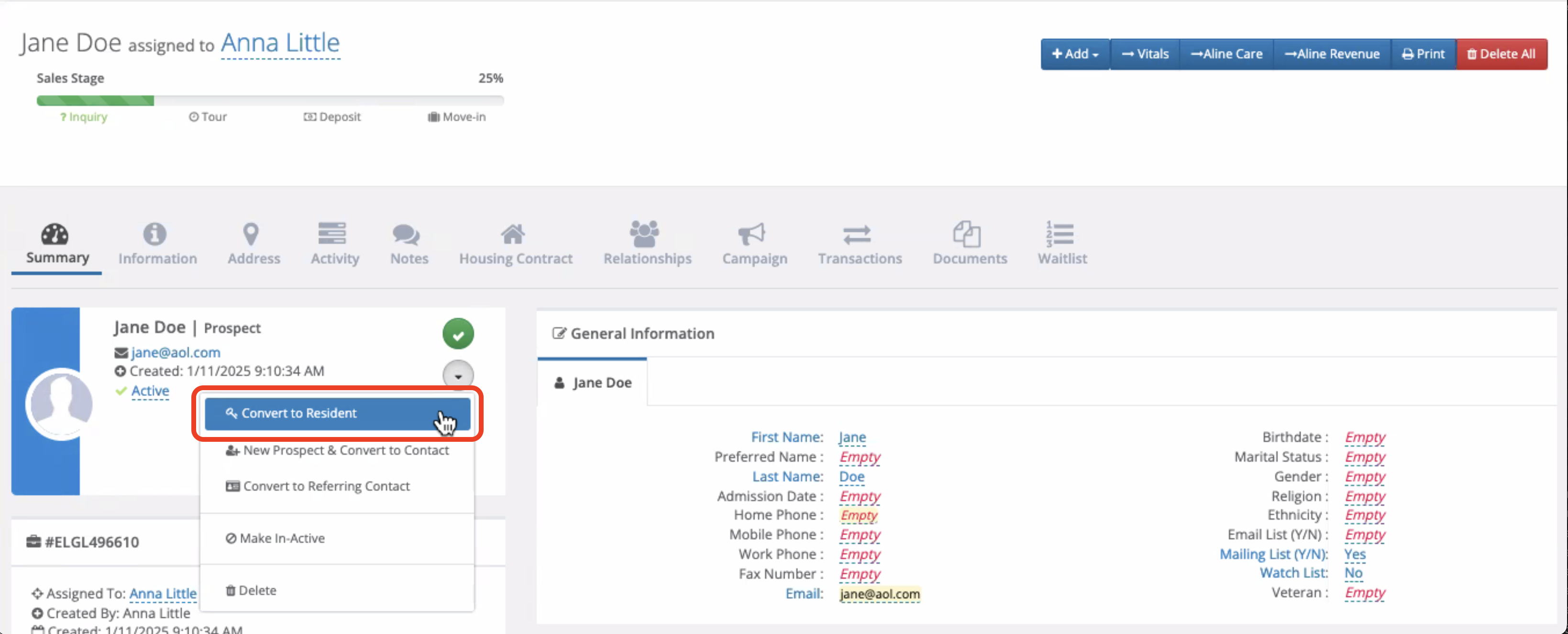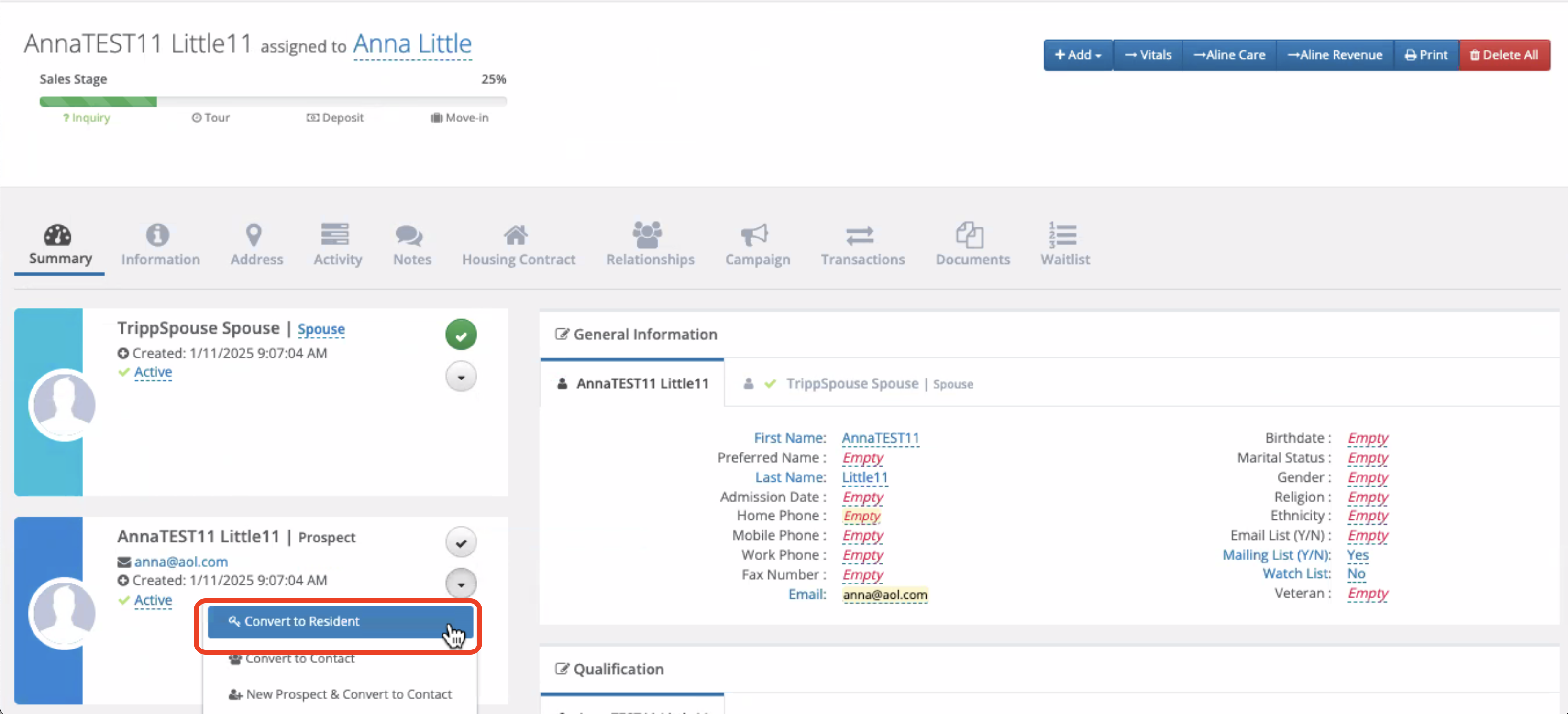 (Don't worry, if the person ends up not moving into your community, you can always convert the individual back to a Prospect, or a couple back to a Prospect and Contact, respectively.)