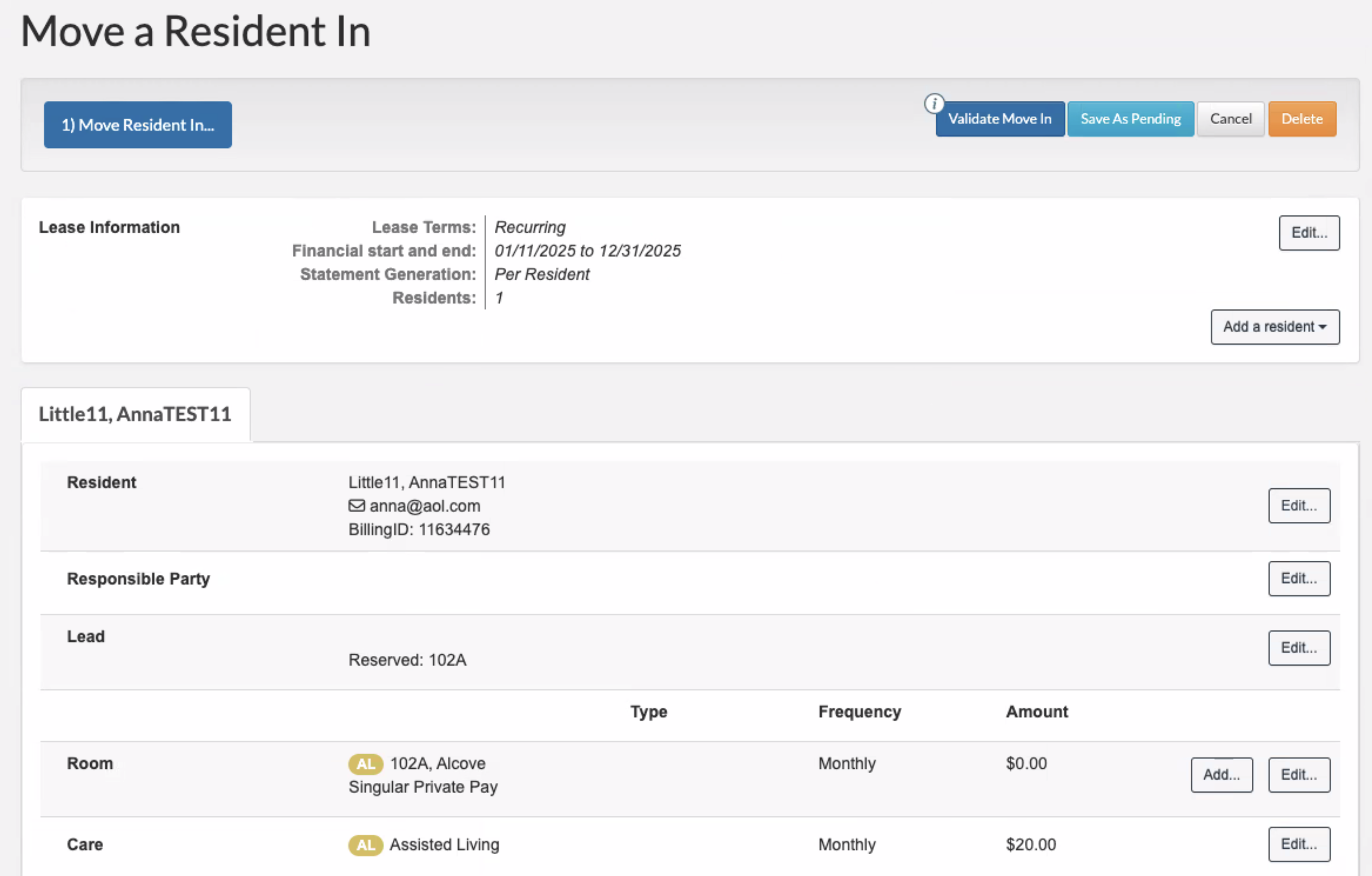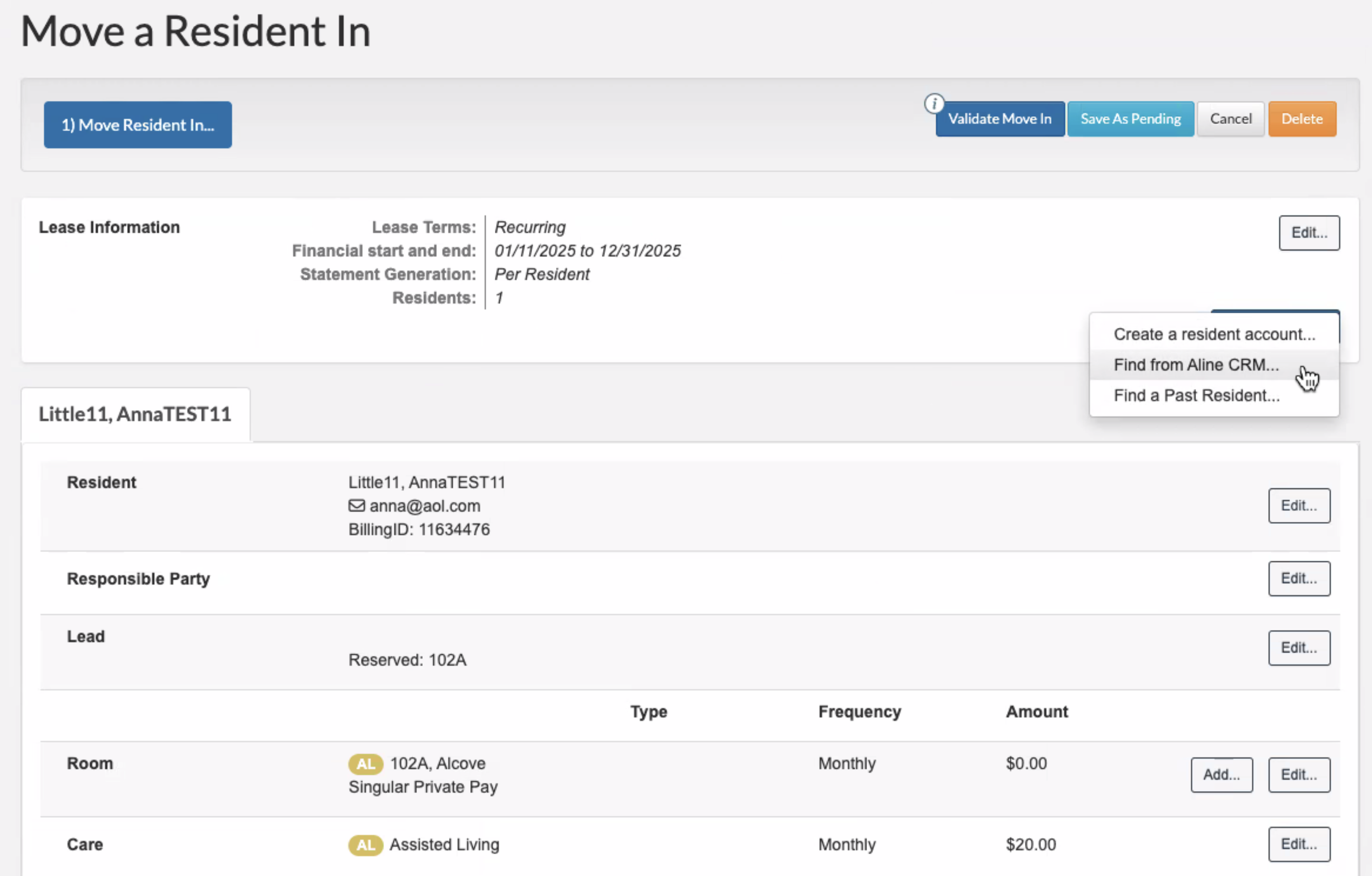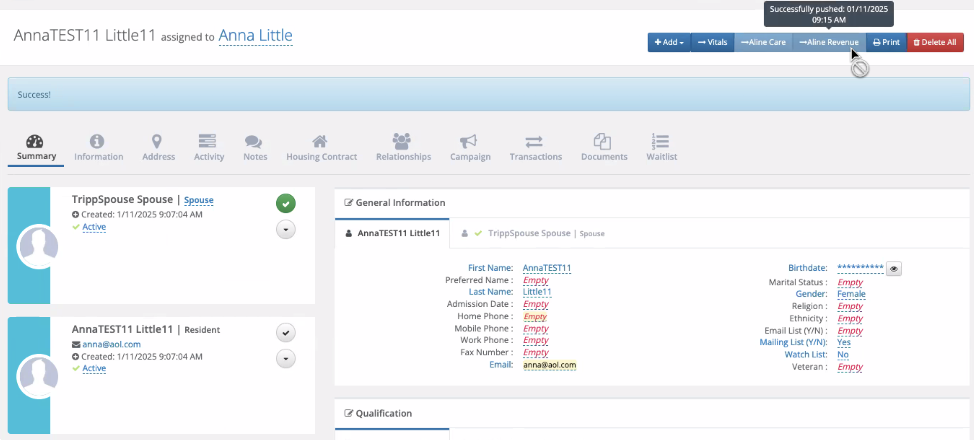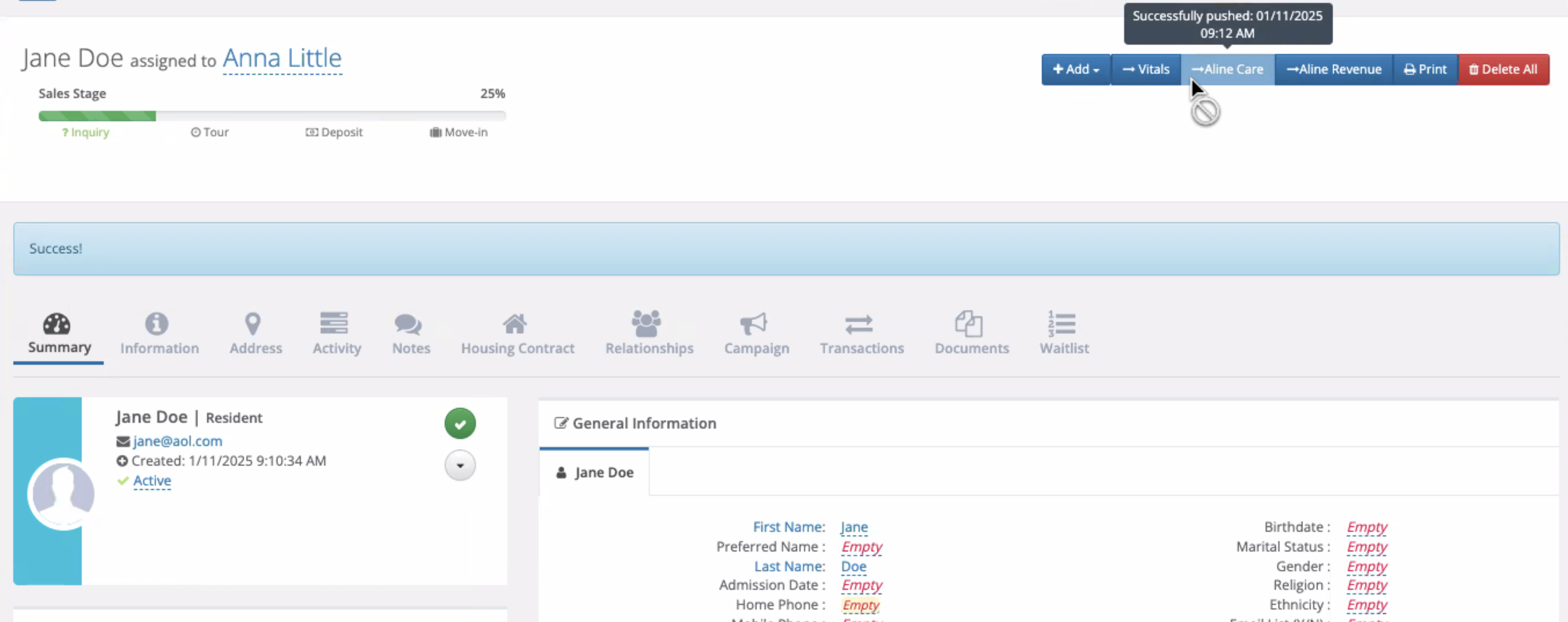Now that the individual is a Resident, you can click on the Send to Aline Care button to push the record to Aline Care, which will allow your care team to complete a pre-move in assessment.
