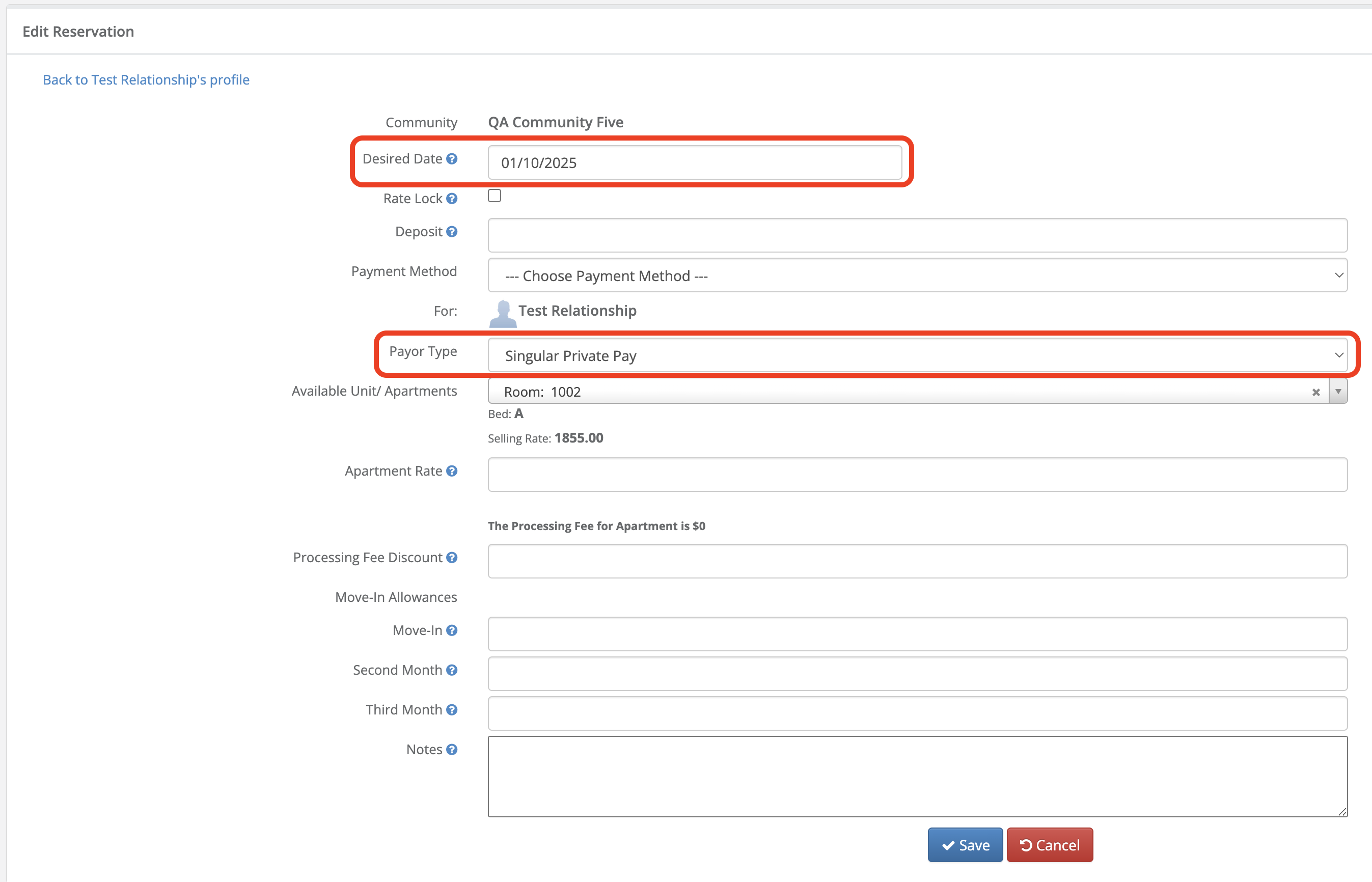 First enter Desired Date and Payor Type, then select the unit from the dropdown and enter other pertinent information before clicking Save.