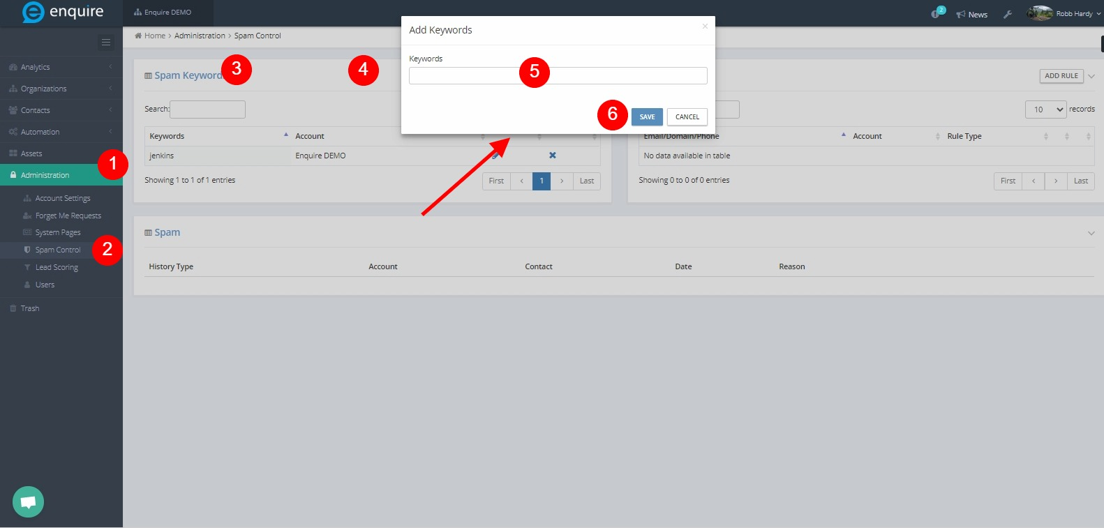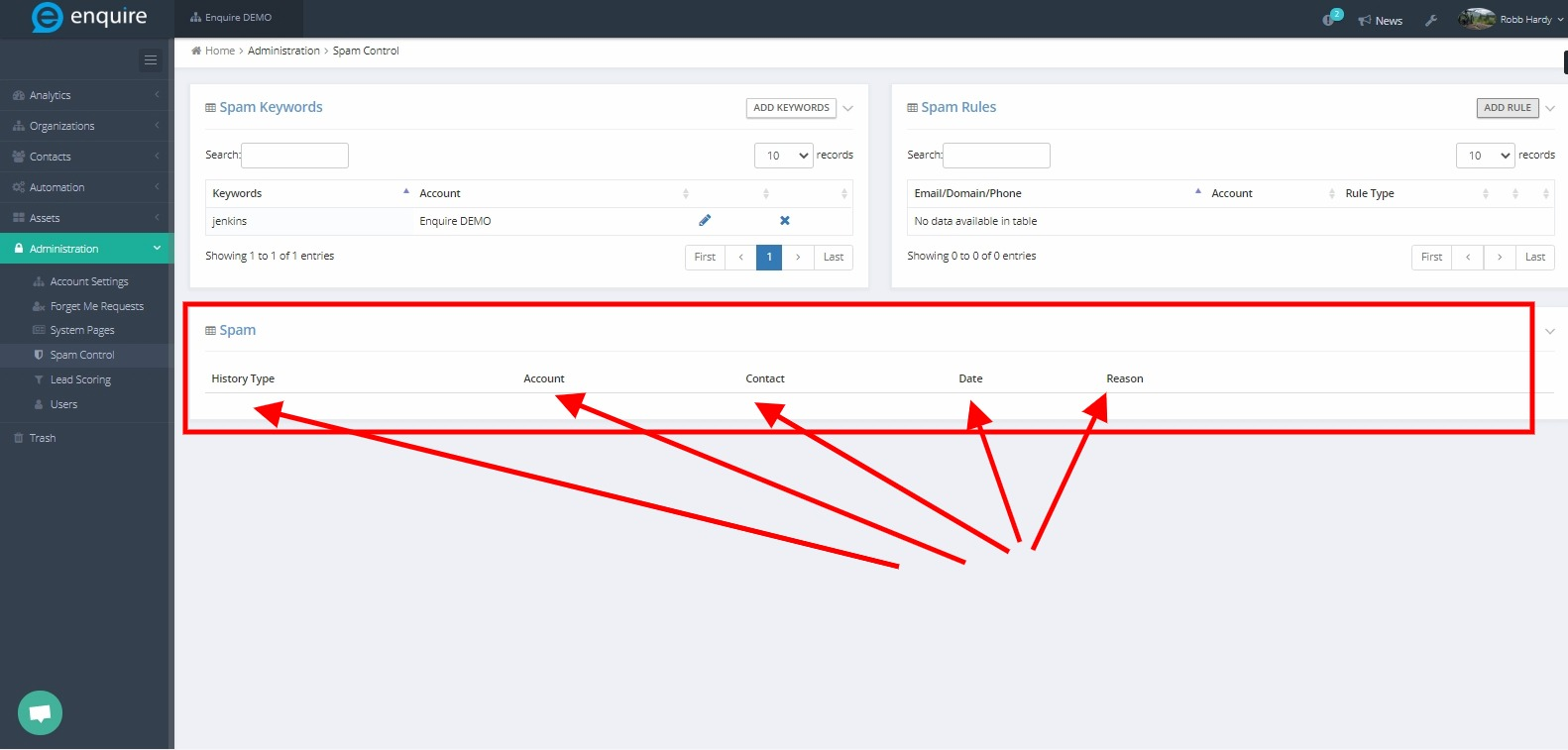 SPAM Keywords are words and phrases that can tell Enquire MAP to look for when someone submits a contact form. If the keyword or phrase is found anywhere within the fields of the submitted form, the contact will be quarantined (see Quarantined Contacts below).