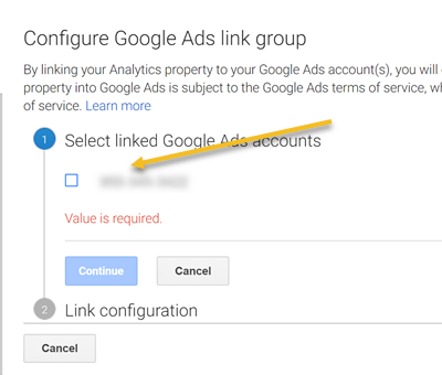 - Select the Adwords account you to link: