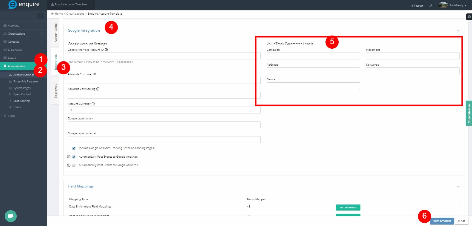 As there is no restriction on the labels used when setting up the parameters, alert Enquire MAP which labels to be used for the parameters in Ads. Navigating to Administration > Account Settings, the User can specify the Value Track parameter labels used in the Ads Account.