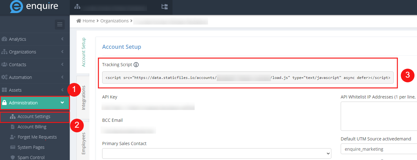 In order for the web form to appear on your website, please ensure that the Enquire MAP tracking script is also present on the page. You can find your Enquire MAP tracking code by navigating to Administration → Account Settings. It is recommended to add this tracking script to the <head> of each page on the website.