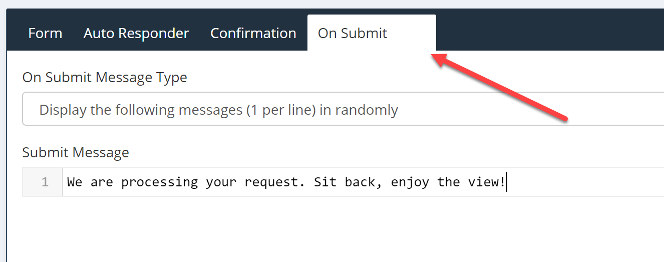 If the user checks the box "Process Autoresponder before confirmation redirect", the confirmation action will be delayed until the auto responder processes. This allows the User to set custom fields on the prospect before the form confirmation page renders. This is great if the User wants to do post-validation on the form, or present specific metadata specific dynamic content on the confirmation page. The downside is that the confirmation page is indeed delayed. To reduce this pain, Enquire MAP supports displaying in process confirmation messaging to relay to the user that post-processing is happening. This messaging displays during the confirmation processing: