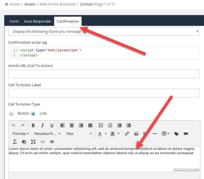 This option replaces the form with the message in the editor. Please note: In-Place confirmations are not available to upload files in the form.