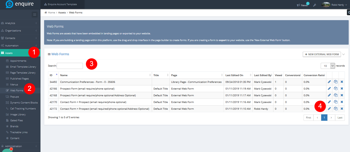 - Go to the Enquire MAP dashboard on left hand side menu to select Assets then Web Forms. From the existing list of forms, select the edit (pencil) icon to enable editing the form.