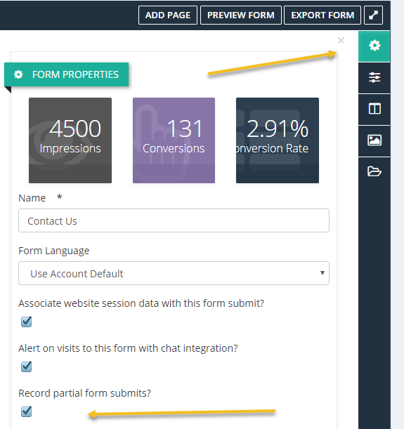 Enquire MAP can collect partial form submits. If someone starts to fill out a form and does not complete the task, the platform can be configured to capture the data. A Partial Form Submit is a contact history item that is created when this is captured. To enable or disable partial form submit capture, in any Enquire MAP form editor, click the Properties icon on the right sidebar then enable or disable partial form capture: