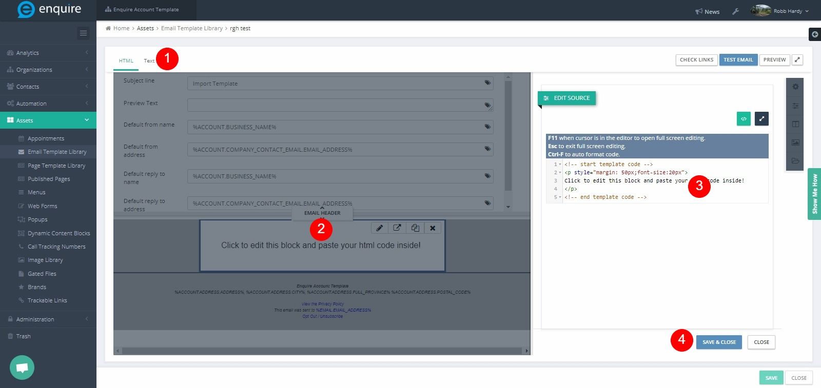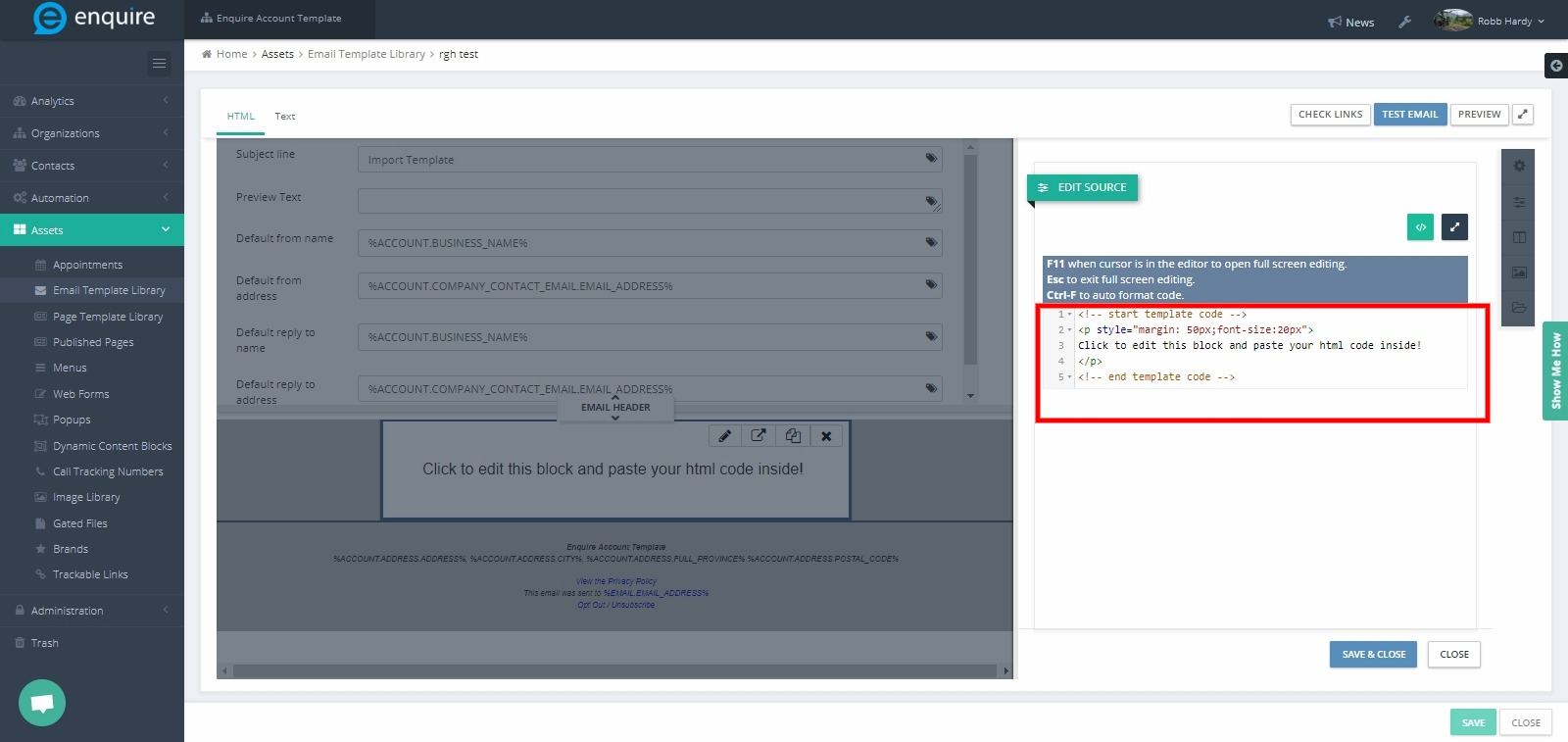 The User can utilize HTML email templates built in other products within Enquire MAP. Please Note: Doing this will remove the drag and drop builder capabilities as the entire email will need to be built within the HTML editor.