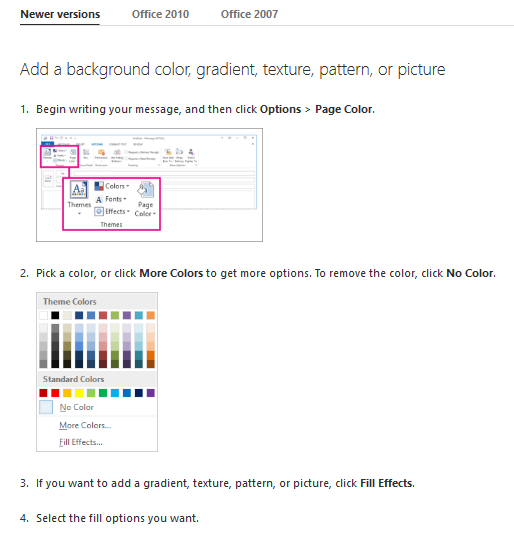 - As background gradients have limited support in MS Outlook, it is important to always set a background color and a gradient. If the set gradients are not supported by the client, then there will be a fallback color rendered. Please see Change a message background in MS Outlook